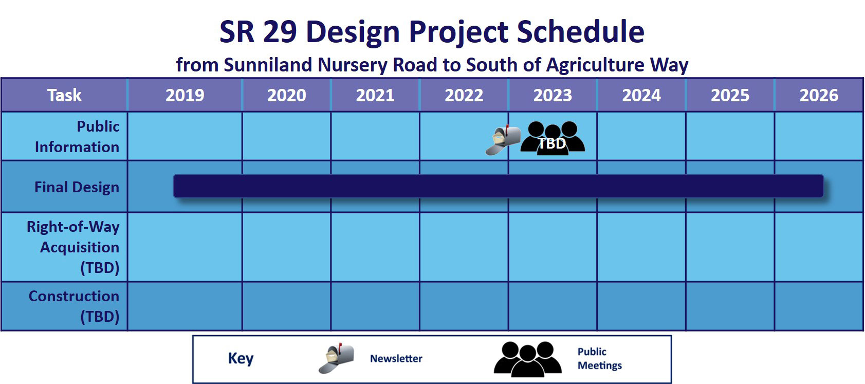 The design phase is tentatively scheduled for completion in 2026. Currently, there is no funding for right-of-way acquisition or construction.