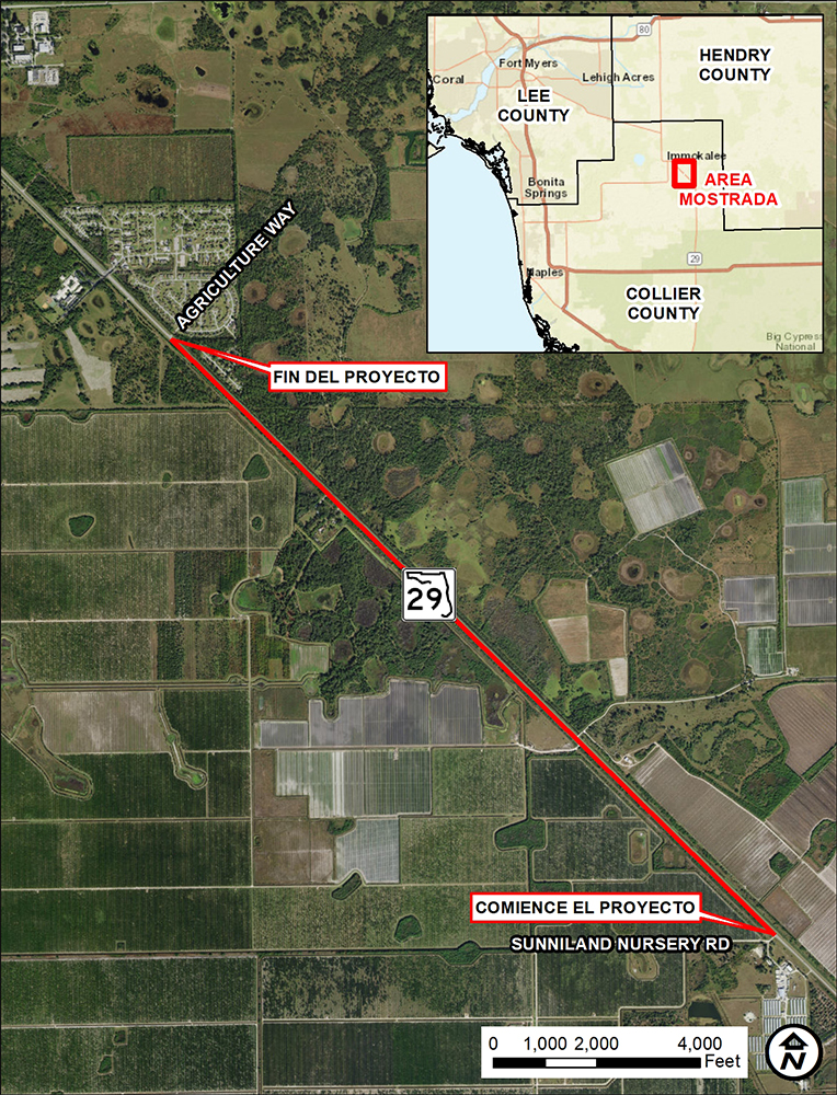 El Distrito Uno del Departamento de Transporte de la Florida (FDOT) esta diseñando mejoras para ampliar la carretera estatal 29 (SR 29) de dos a cuatro carriles entre Sunniland Nursery Road hasta el Sur de Agriculture Way. Las propuestas de mejoras ampliaran la carretera estatal 29 (SR 29) hacia el lado oeste de la carretera existente con carriles en dirección norte y sur separados por una mediana de césped de 40 pies de ancho. El ancho del derecho de paso existente varía desde 173 pies a 181 pies. Sera requerido adquirir derecho de paso para estanques de aguas pluviales y para realineacion de la intersección de una carretera privada ubicada del lado oeste de la carretera estatal 29 (SR 29) aproximadamente una milla al norte de Sunniland Nursery Road.